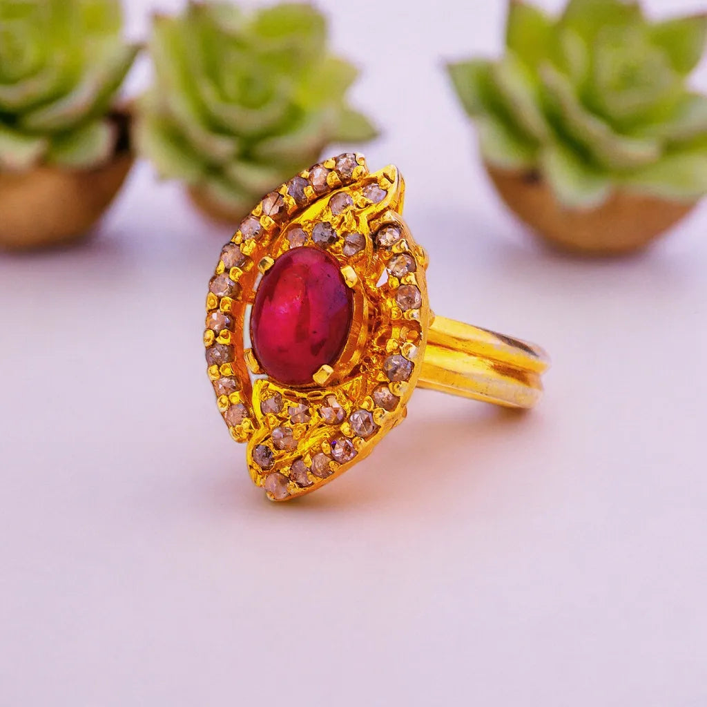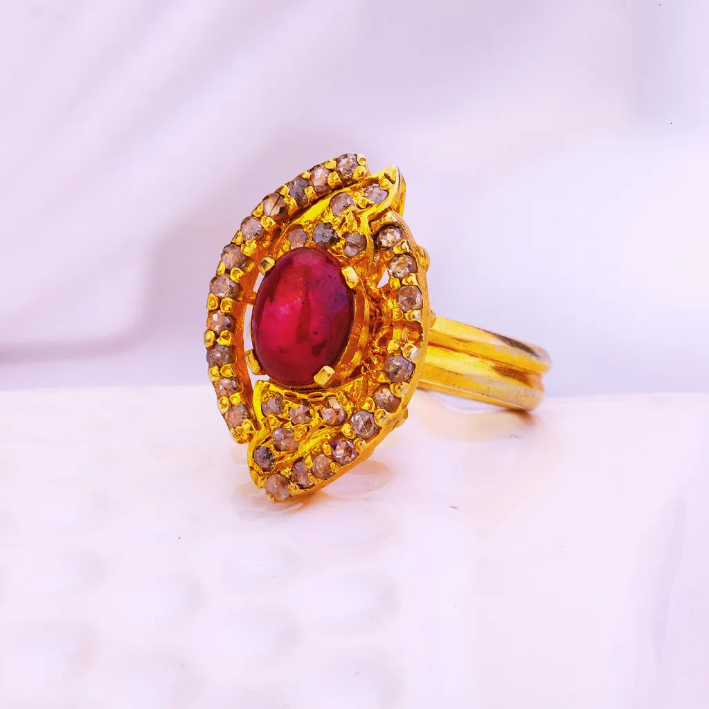Slip into sophistication with Sujhal's glamorous Fiery Loop. This luxurious ring flaunts a brilliant ruby centerpiece that mesmerizes with its passionate red glow. But the real flame comes from the 18K gold craftsmanship and dazzling moissanite plating, elevating the design with unparalleled luxury. Drawing inspiration from exotic Bengali artistry, the ring's elegant silhouette exudes timeless style and charisma. Slip it on and feel that irresistible spark—whether hitting the town or dressing up a casual look. With the Fiery Loop's smoldering ruby and high-end materials, your jewelry box is about to get a whole lot hotter.