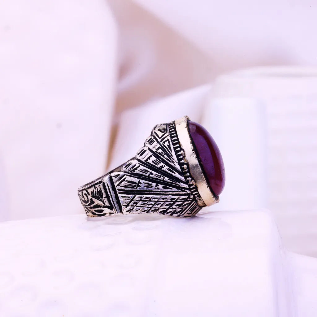 Add this garnet veil ring to your jewelry box and never blend in again. This luxury piece from Sujhal features an opulent, deep red garnet stone set in oxidized silver that gives it an antique, heirloom look. A statement ring in every sense, the garnet veil turns heads and starts conversations everywhere you go. Slip it on and let this standout accessory elevate any outfit, whether you're dressing up for a special occasion or simply want to feel like royalty on an ordinary day. Luxurious yet wearable, this is one ring that won't be relinquished to the depths of your jewelry box anytime soon.