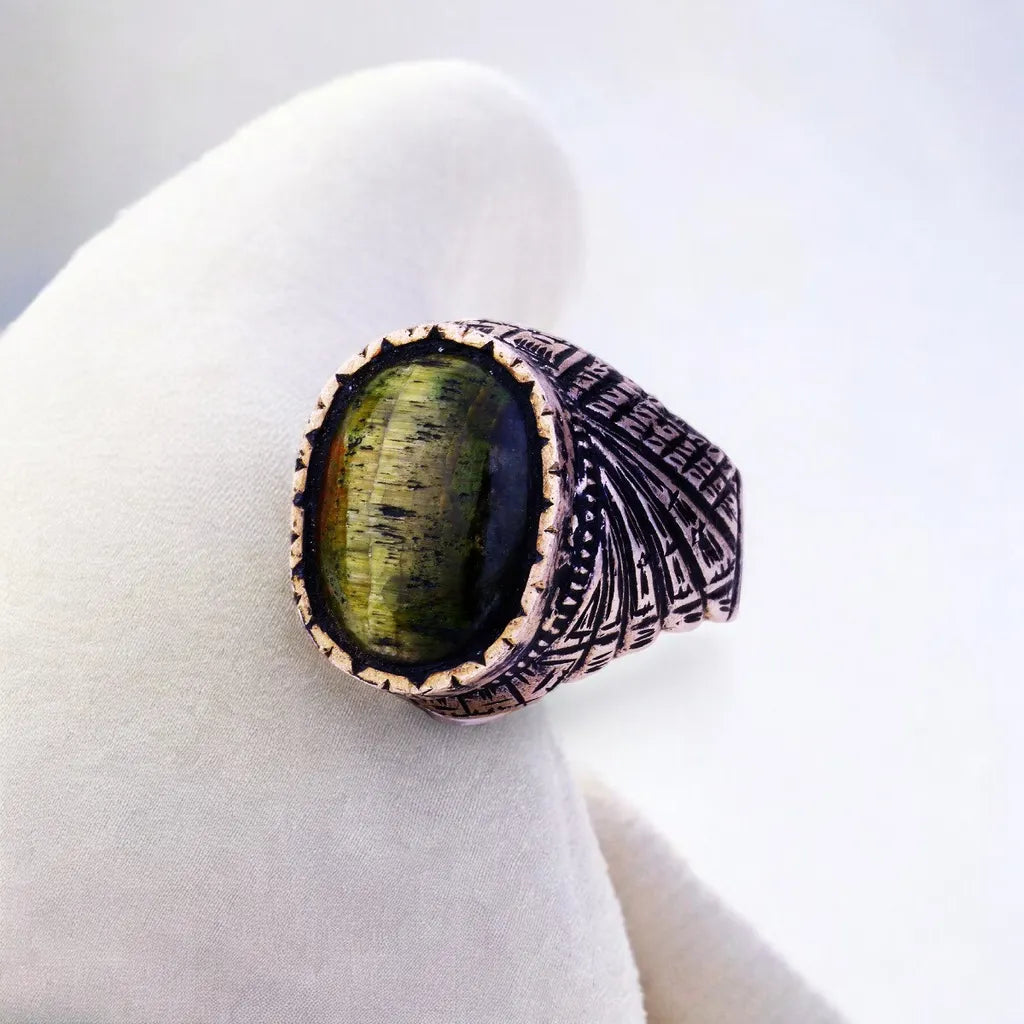 Prepare to be mesmerized by the celestial beauty of this Cats Eye Twilight ring. The iridescent "Cats Eye" gemstone is the star of the show, shifting between captivating shades of gold, green and blue in a dazzling color-changing display. An oxidized finish lends the ring an antique-inspired look, accentuating the gem's kaleidoscopic hues like a cosmic light show. Crafted with luxury in mind, this statement ring lets you wear a piece of the night sky on your finger. Whether as an everyday statement maker or the perfect accessory for a special occasion, this chameleon-like jewel will have all eyes transfixed. Elevate any look with this spellbinding gem. Cats Eye Twilight ring - luxury for the astral traveler.