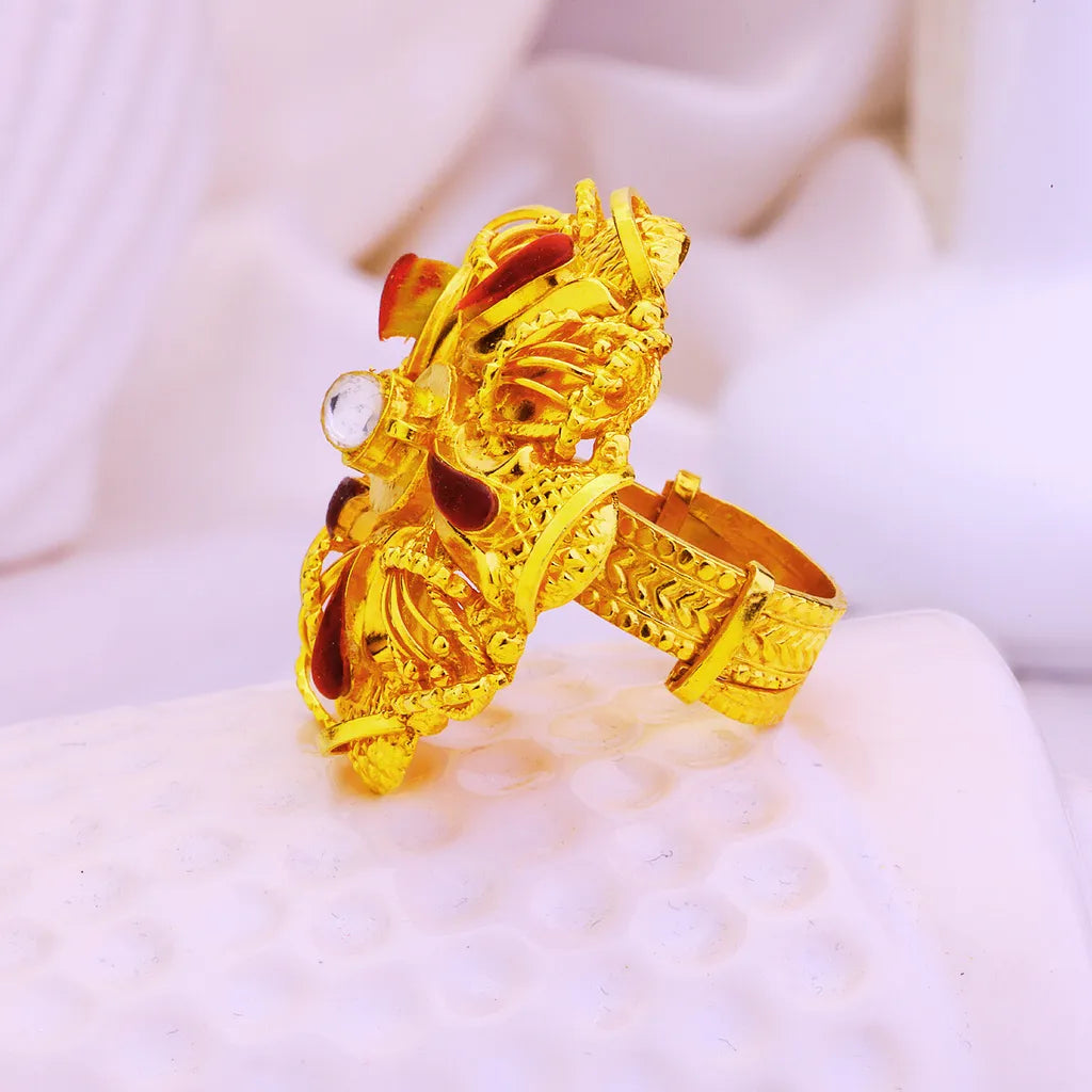 Treat yourself to the affordable luxury you deserve with these ornate jadau rings from Sujhal. Meticulously crafted with 18K gold, each ring shimmers with dazzling rubies and moissanite set into intricate Indian jadau metalwork designs fit for royalty. These opulent statement pieces strike the perfect balance between premium materials and attainable indulgence—elevate any outfit from drab to fab with their breathtaking glamor. Whether for a special occasion or simply because you're worth it, these rings exude sophistication that commands attention and turns heads. Affordable luxury has never looked so exquisite.