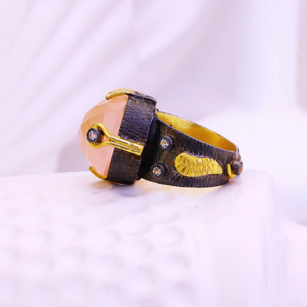 Black rhodium and 18K gold collide in rapturous union, forging a ring of oceanic allure. This Nautical Radiance Ring from Sujhal summons the mesmerizing depths of the sea through a rose quartz centerpiece framed by scintillating moissanite accents. As light dances across the gemstone blend, a kaleidoscope of rosy and golden refractions unfurls—stirring visions of sunsets mirrored on tranquil waters. More than just a ring, it's an artful adornment manifest through centuries of Bengali craftsmanship. Each gemstone has been handpicked for its brilliance; each metal hammered to perfection. The result? An heirloom-worthy design that bestows every ensemble with radiant elegance befitting of luxury itself. Wearers will feel as though they've captured the sea's untamed beauty on their finger.