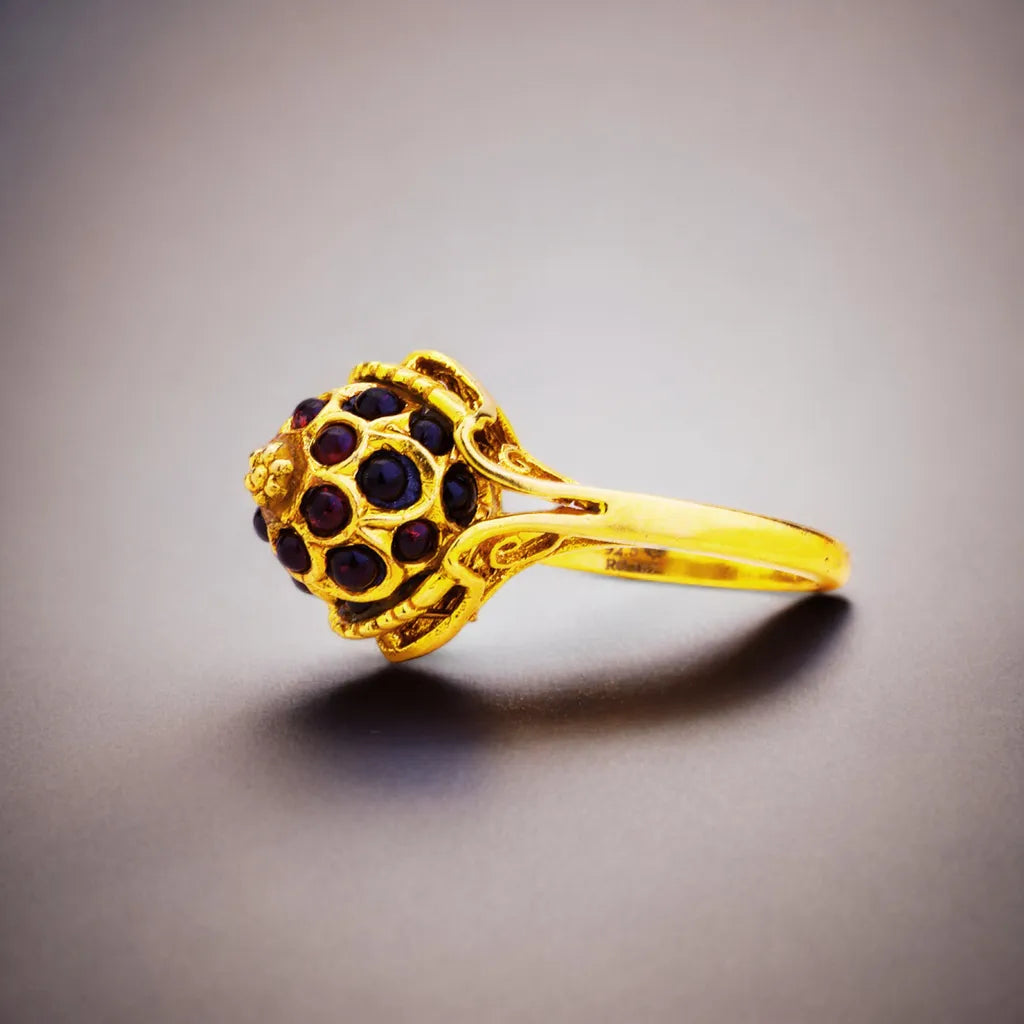 Make a statement with the Garnet Berry ring from luxury jeweler Sujhal. This eye-catching accessory showcases a vibrant garnet gemstone that radiates rich, red brilliance. Plated with decadent 18K gold, the ring exudes a luxurious look and feel. But behind its showstopping style lies a deeper story of skilled Bengali craftsmanship passed down through generations. Meticulously handcrafted by artisans, each ring is a testament to cultural heritage and timeless techniques. Slip on the Garnet Berry for an instant touch of sophistication that elevates any ensemble.