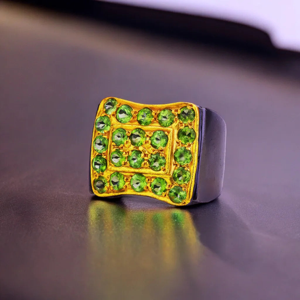 The peridot cascade ring is an accessory to indulge in. The gemstone's hypnotic green sparkles with all the allure of luxury while the 18K gold plating and sleek black rhodium elevate the look to high-fashion heights. Yet beneath their opulent exterior lies intricate Bengali craftsmanship, reflecting jewelry-making traditions stretching back centuries. Both classic and contemporary, these rings merge timeless elegance with modern boldness, their gold and black contrast radiating confidence. Adorned with peridot's enchanting hue--a symbol of renewal--these accessories are an ideal way to refresh your jewelry collection for spring. So slip this accessory on your finger as a reminder that luxury needn't be off-limits: beauty this exquisite deserves an everyday indulgence.