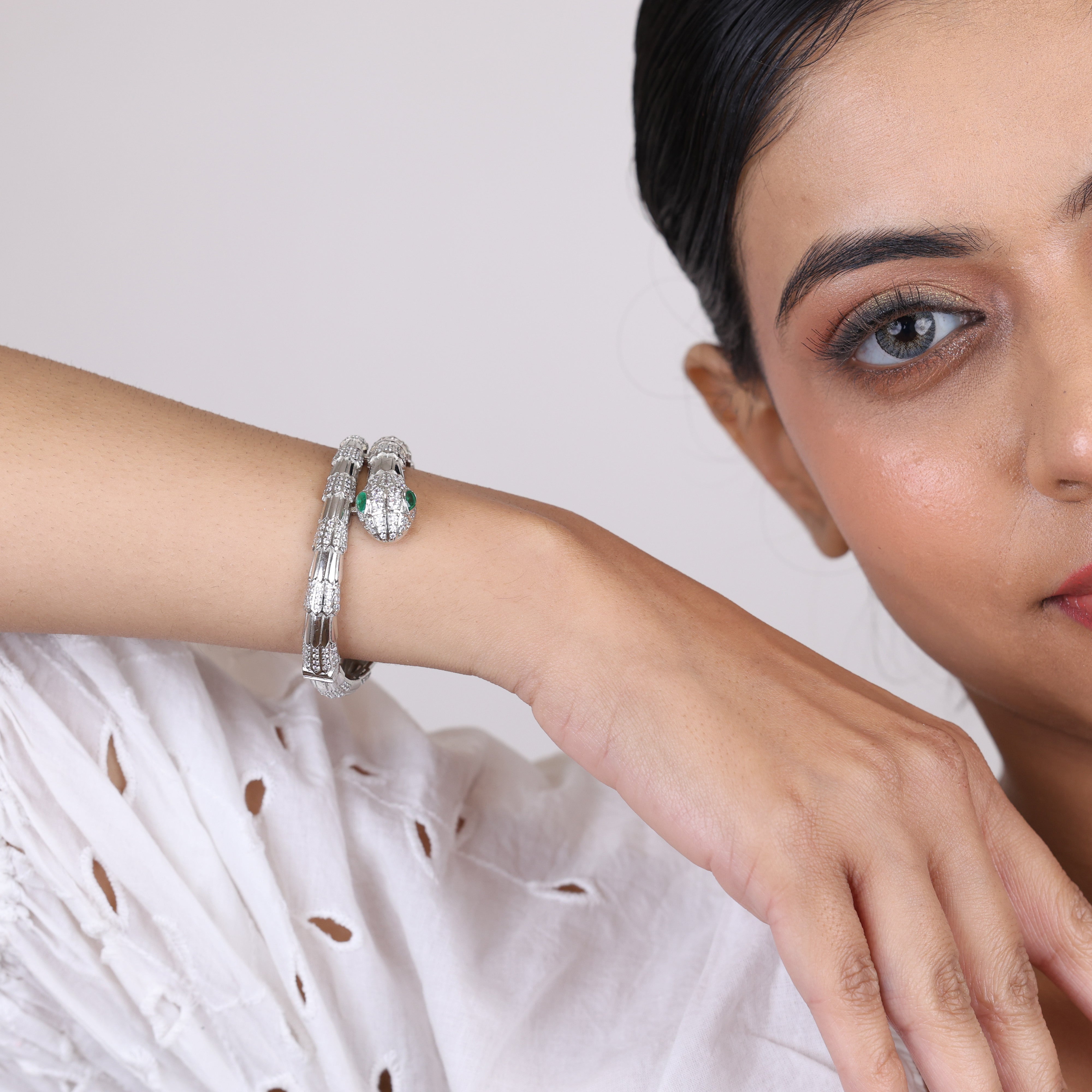 Slithering with regal elegance, the Serpent Queen bracelet coils around your wrist like a beguiling serpentine deity. Hand-crafted by skilled Bengali artisans, this exquisite emerald and rhodium-plated piece radiates sultry glamor and mystique. Shimmering genuine emerald gemstones encircle your arm in a refreshing burst of verdant color, while the sleek white rhodium plating shines with opulent sophistication. A tantalizing symbol of power and allure, the Serpent Queen's sinuous curves elevate any ensemble with a spellbinding dose of luxury. Let this striking serpent slither its way into your jewelry collection.