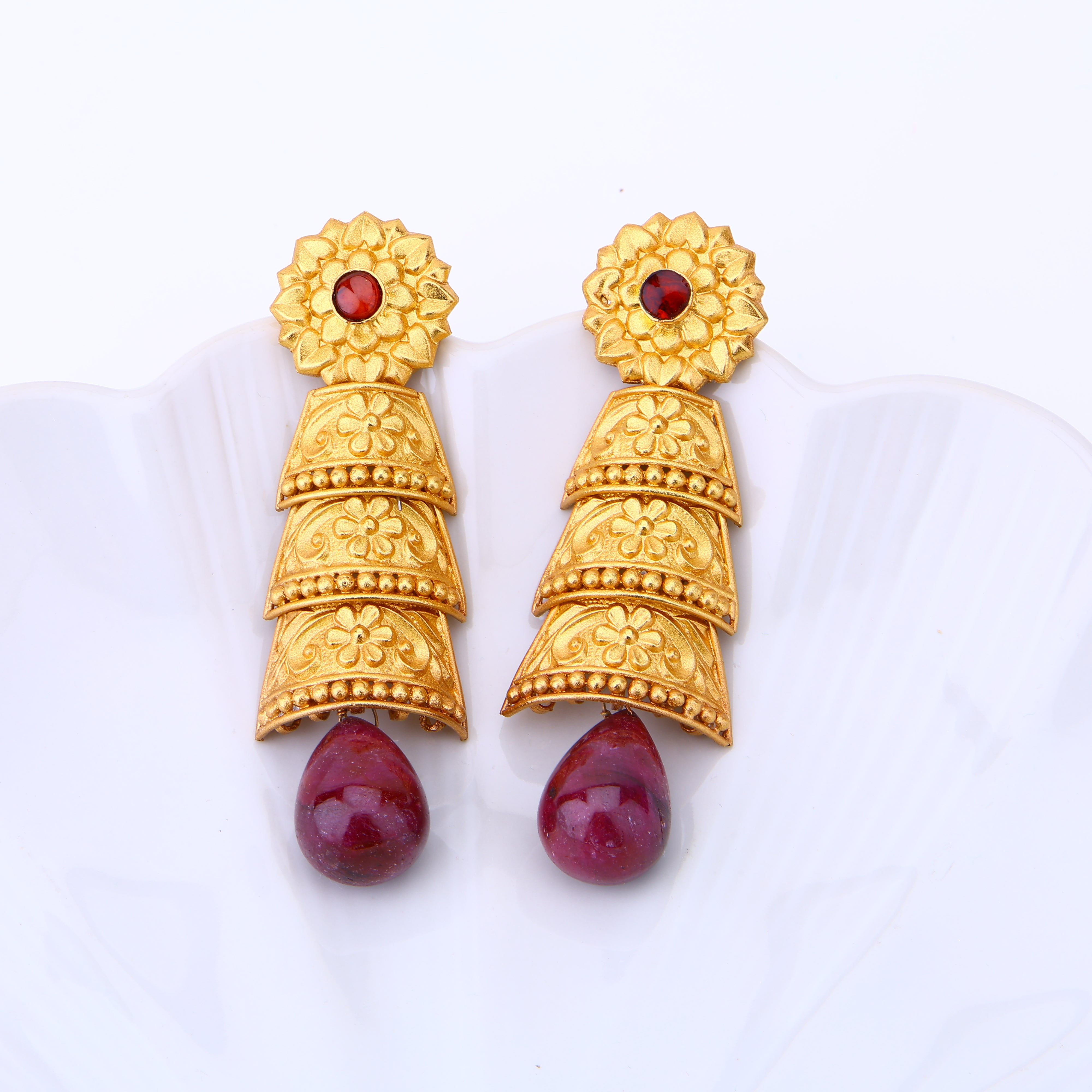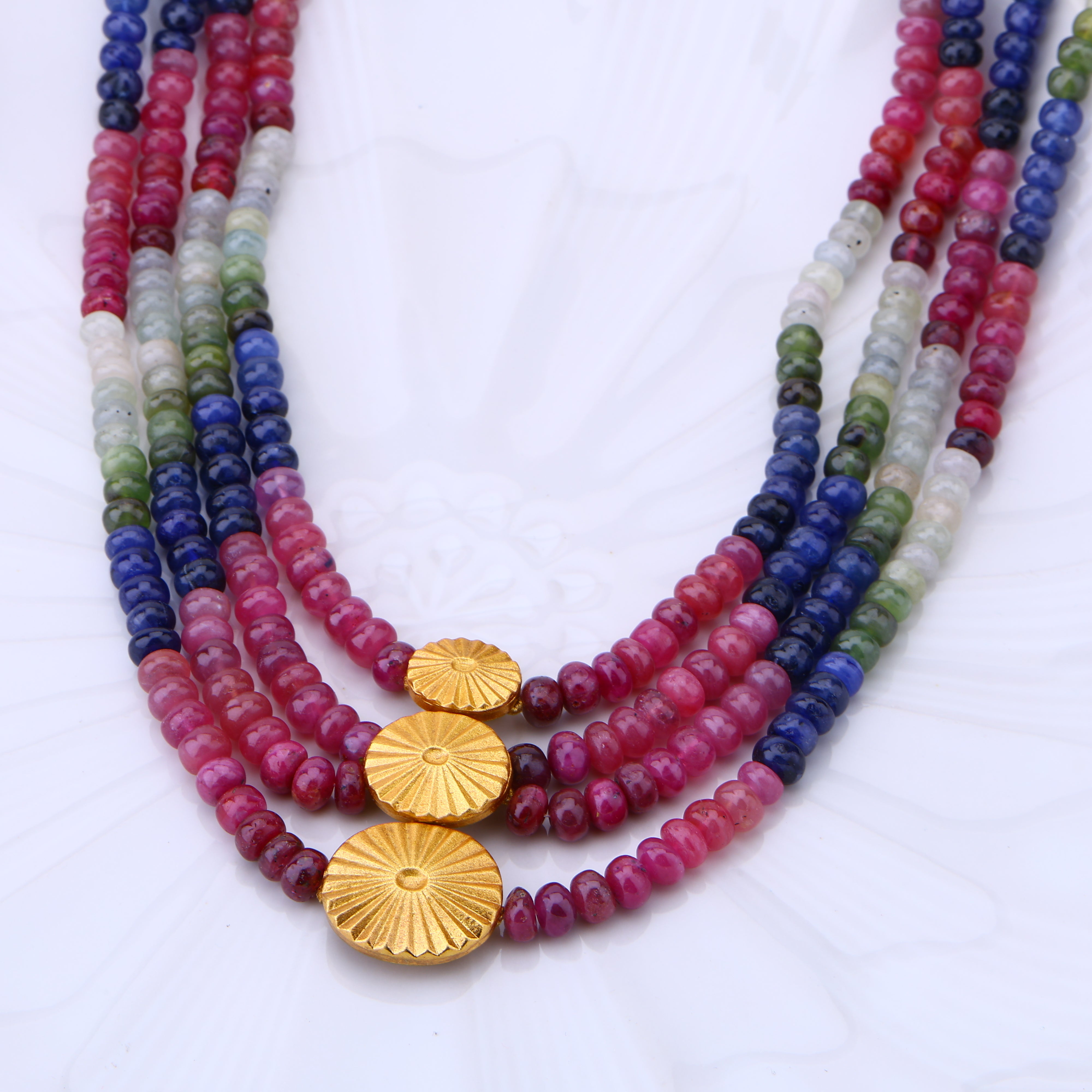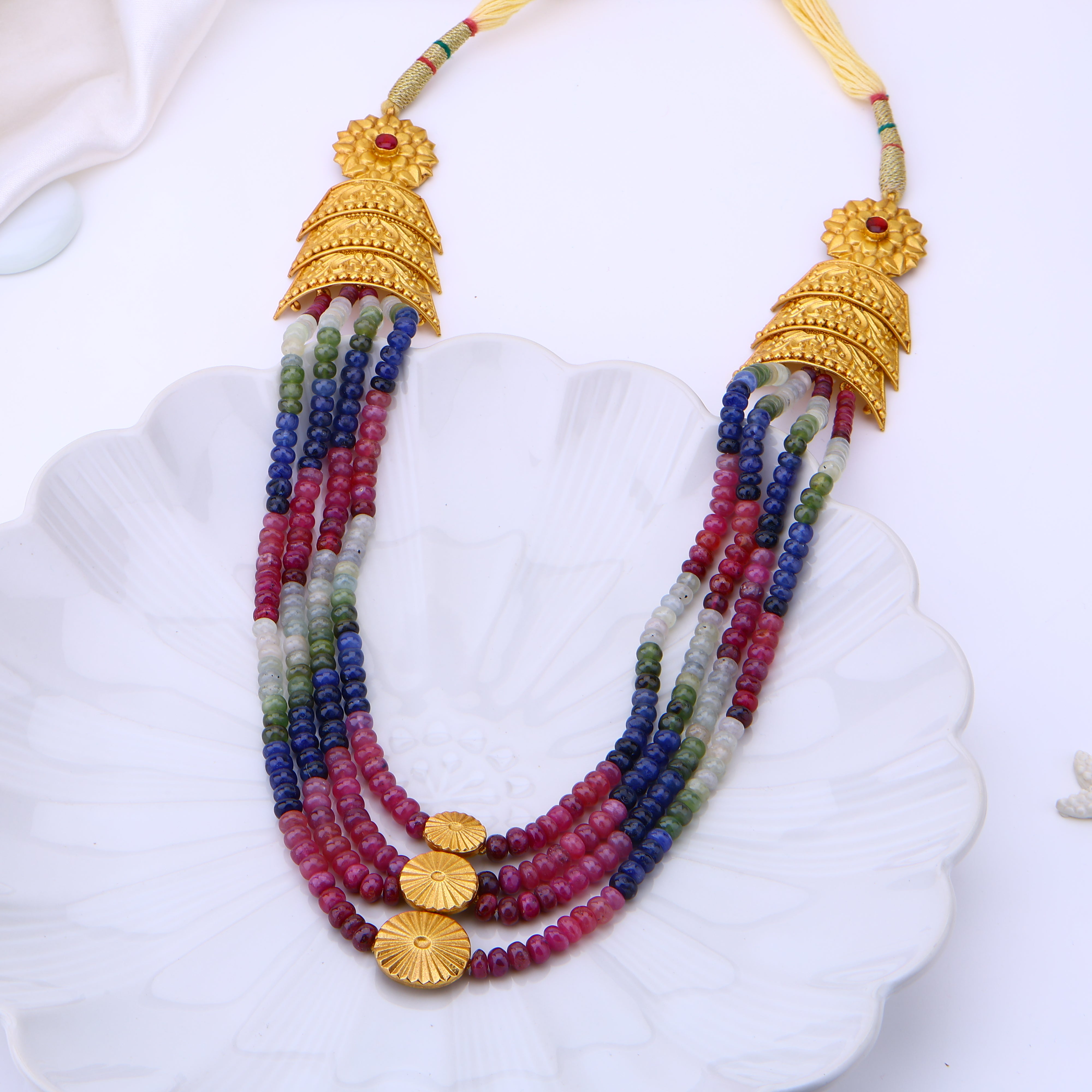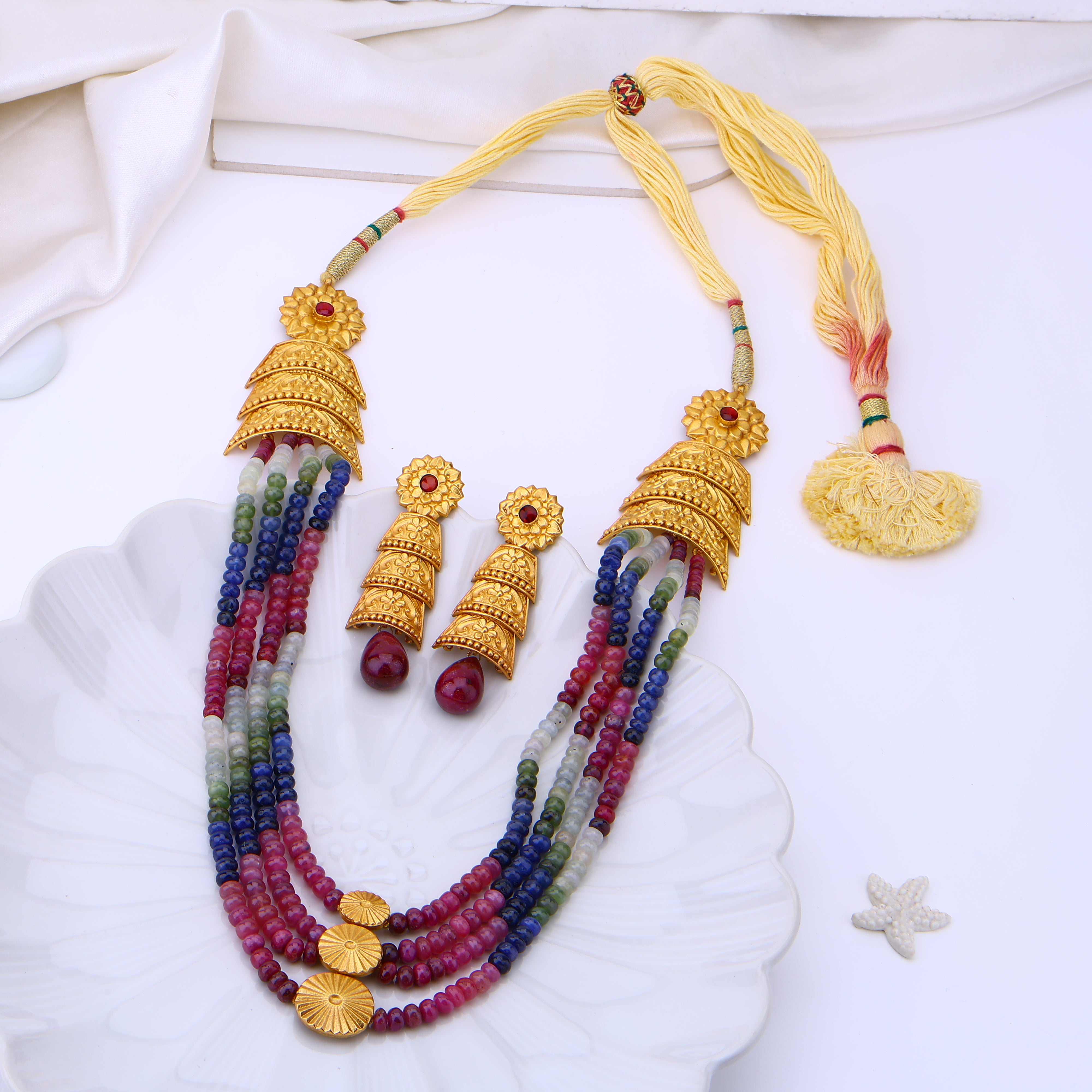 This handcrafted necklace set is a breathtaking vision of elegance. Bengali artisans have meticulously arranged a radiant array of genuine rubies and multi-colored sapphires in an opulent 18K gold-plated design. The intricate metalwork exudes timeless sophistication, while the vibrant gemstone medley elevates the set with luxurious flair. Each piece is an exquisite masterclass in craftsmanship that blends Eastern tradition with contemporary style. Heirloom quality meets modern refinement in this regal yet wearable showstopper. Whether elevating an evening look or lending radiance to casual daywear, this multifaceted set lets your inner brilliance shine through. A splurge-worthy keepsake for generations to come.