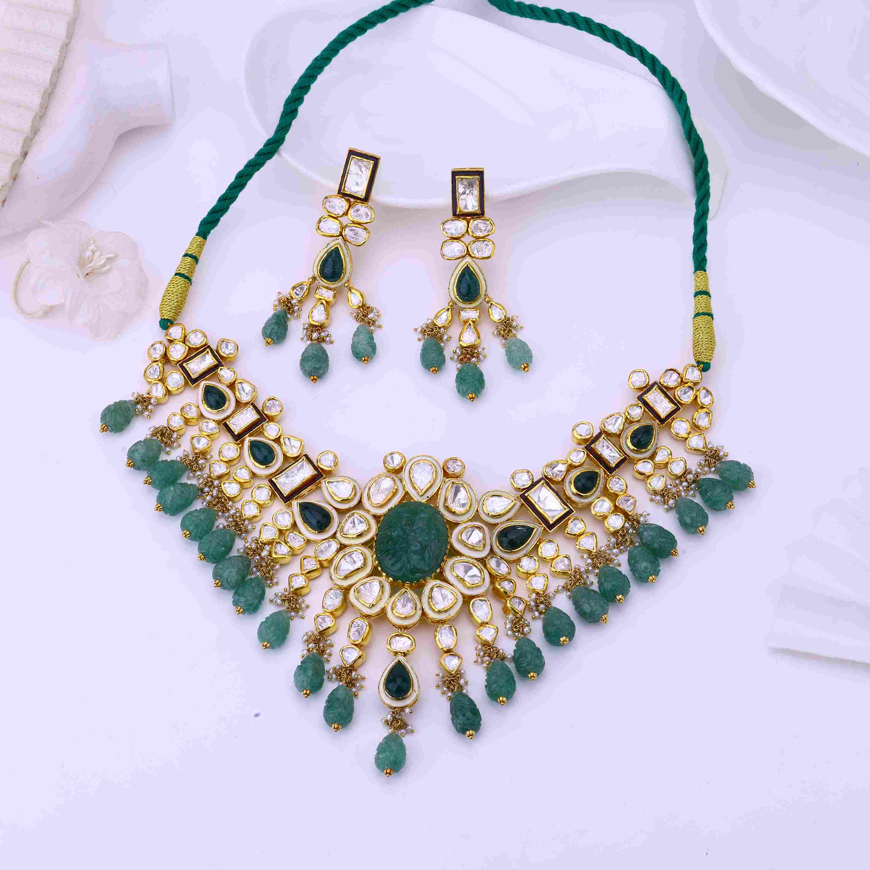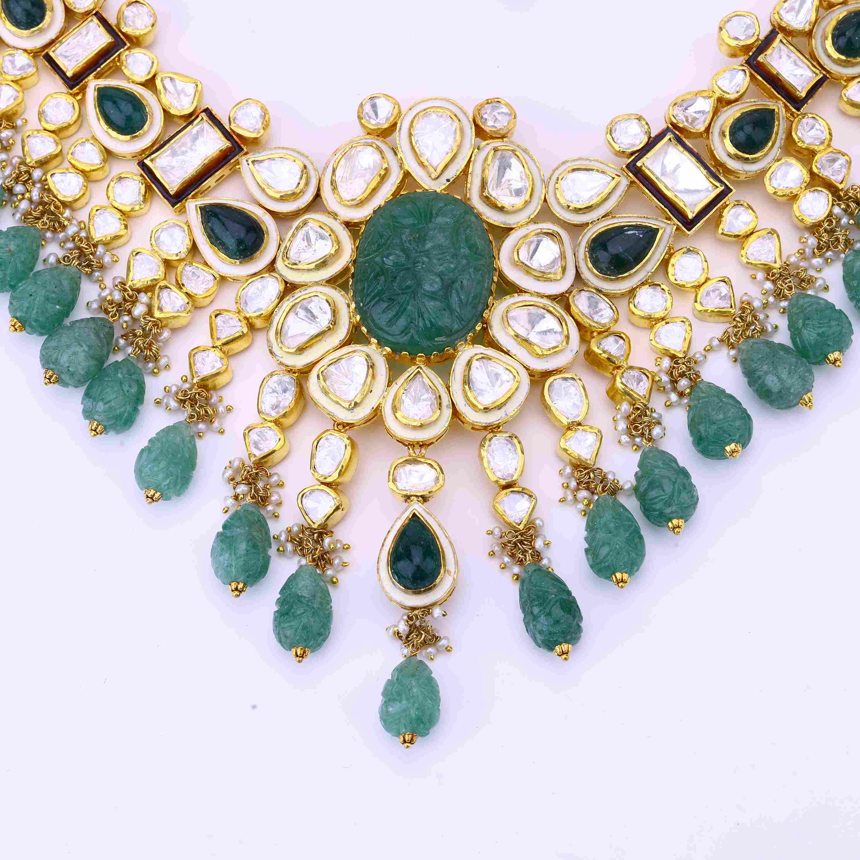 What happens when nature's treasures are reimagined through the lens of timeless artisanship? The Chariots Verdure necklace set emerges, a study in resplendent opulence. Meticulously handcrafted using centuries-old Bengali traditions, this set marries regal emerald carvings with the fire of moissanite gemstones and the iridescent allure of khakho pearl enamel. A sumptuous 18k gold plating unifies the precious materials into one seamless, sculptural masterpiece. More than mere adornment, this necklace set transcends the ordinary to become a wearable work of art, a shimmering embodiment of luxury at its finest. For those who understand that true style has no bounds, The Chariots Verdure makes an unforgettable statement.