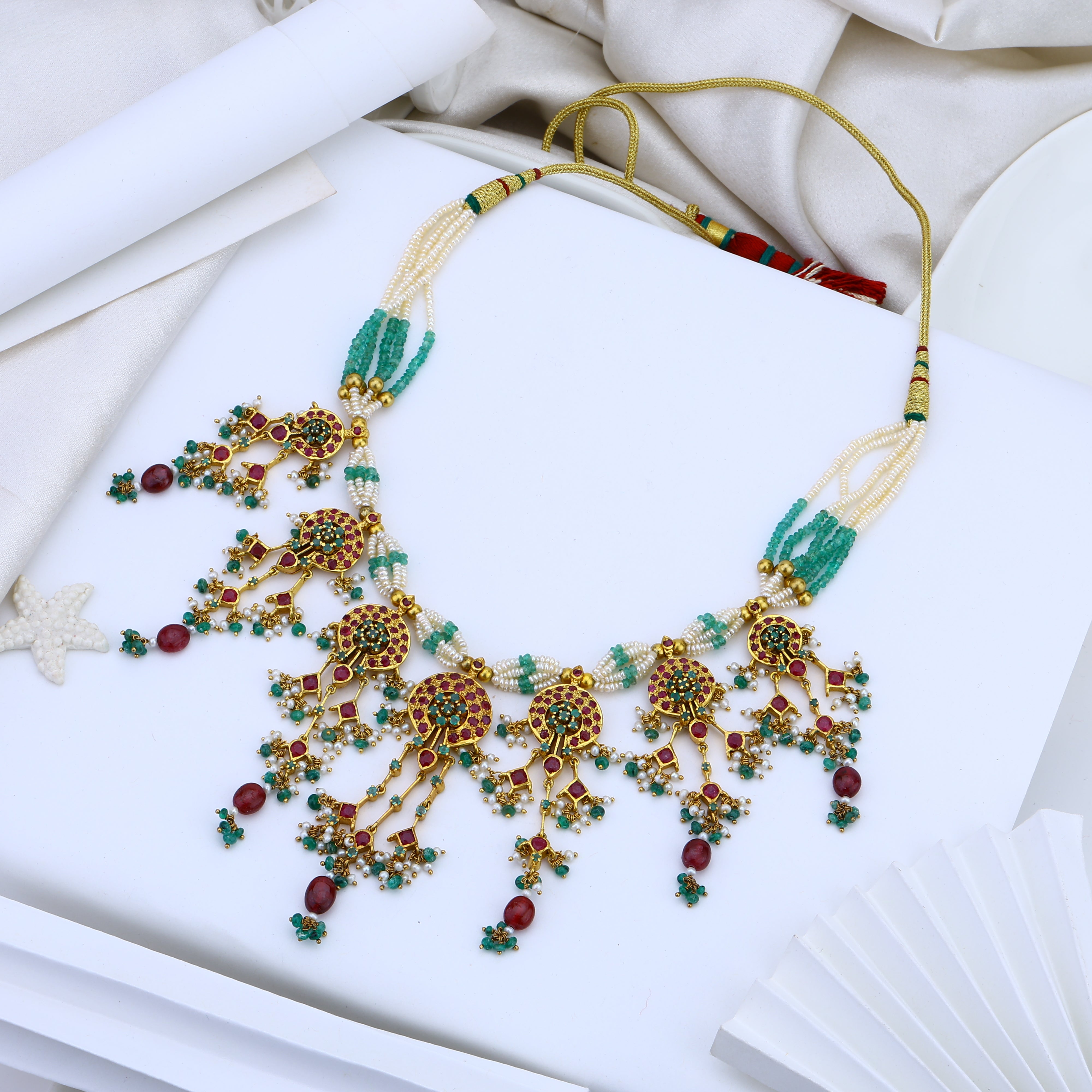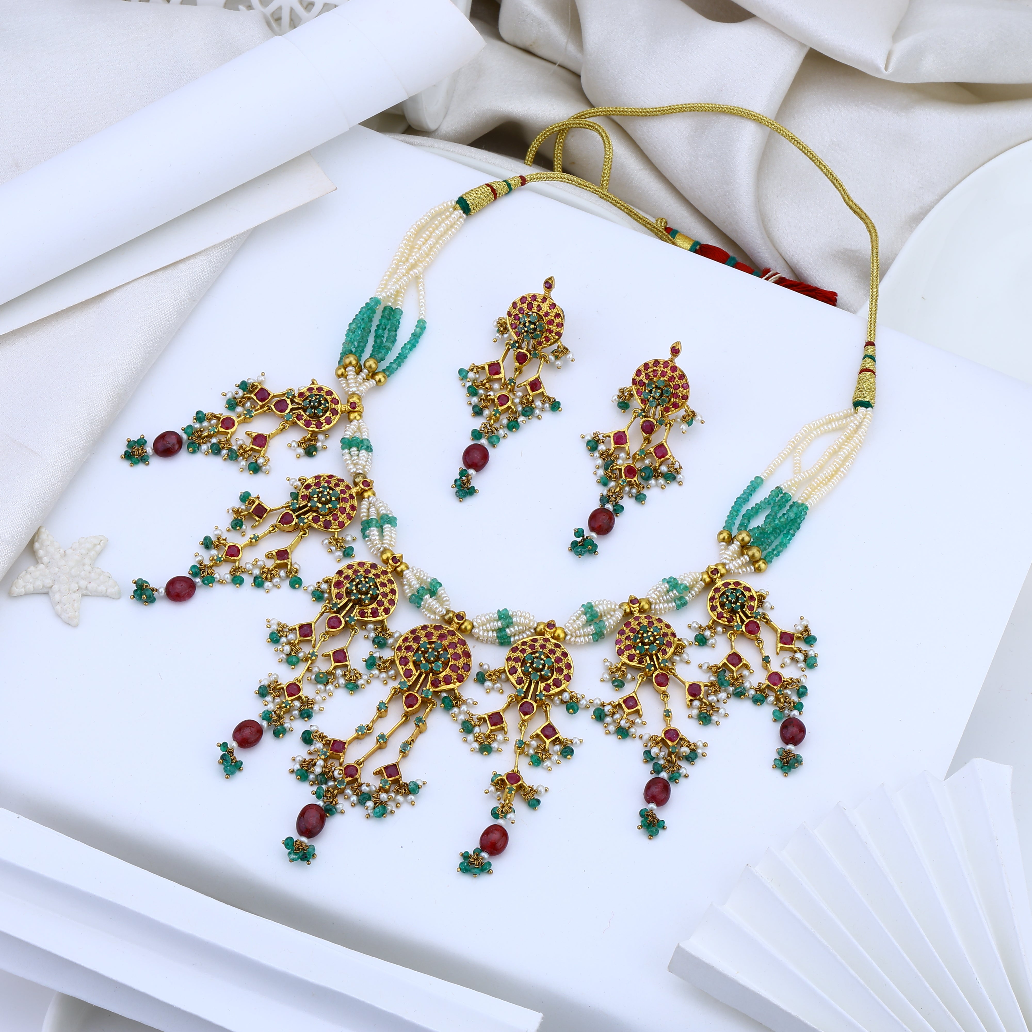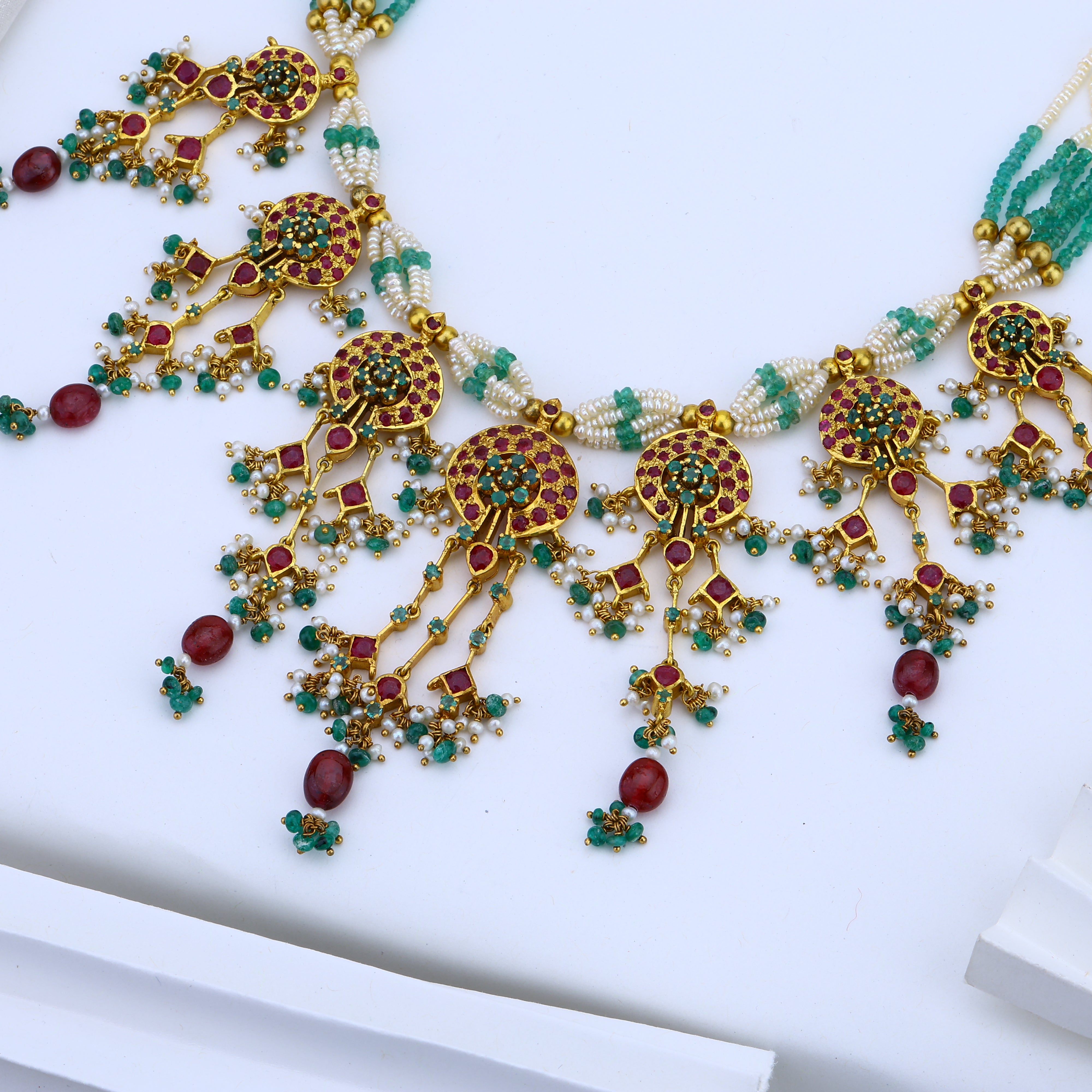At first glance, this necklace captivates with its lush rubies, vivid emeralds, and luminous khakho pearls. Each precious gem shines with its own mesmerizing depth of color. A rich 18K gold plating casts a radiant glow, elevating the jewelry to new heights of luxury and sophistication. But look closer, and you'll discover exquisite artisanal craftsmanship. Meticulously handcrafted by Bengali artisans using time-honored techniques, this necklace set is a treasured cultural heirloom waiting to be passed down. Drape it over your collarbone, and the jewels become a head-turning statement piece infused with history, tradition and beauty. Meant to be cherished for generations, this necklace transforms ordinary moments into something extraordinary.