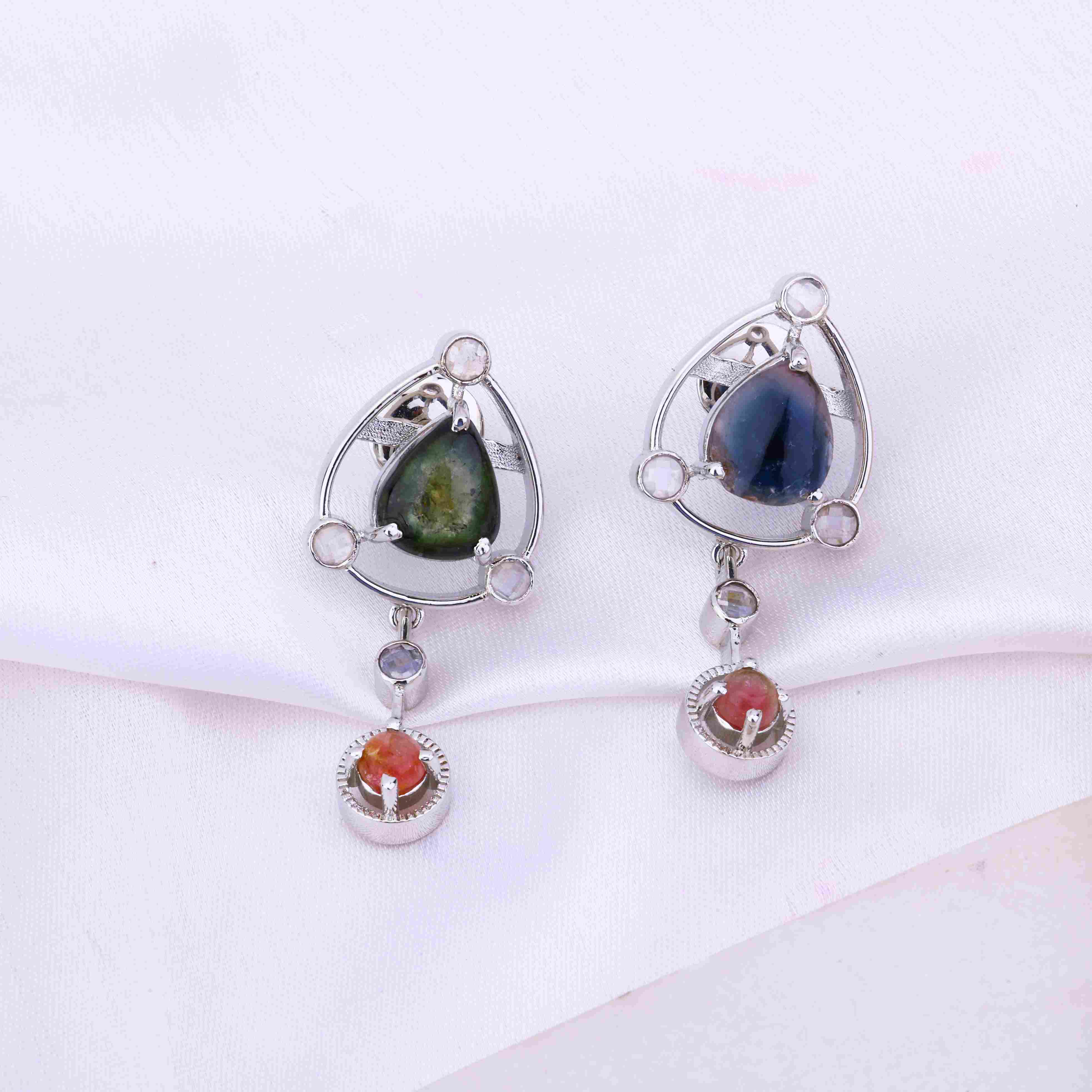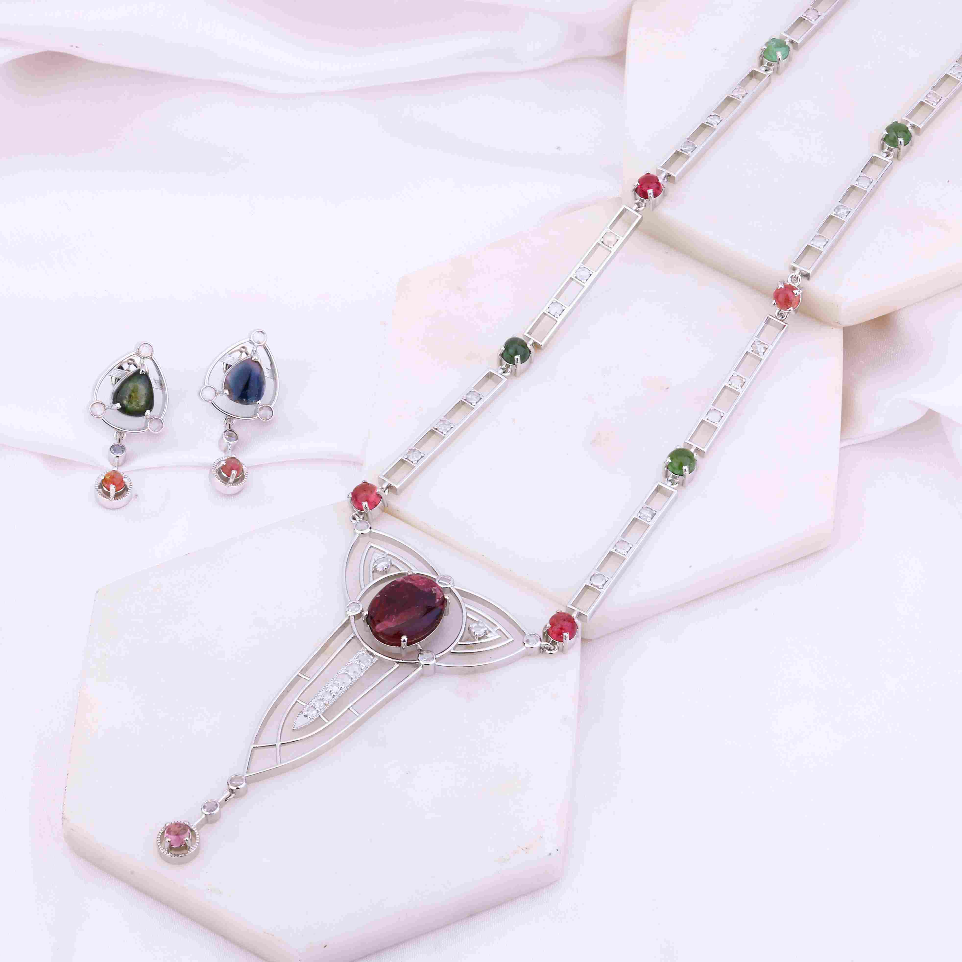 This exquisite necklace set is what happens when artistry meets opulence. The centerpiece - a deep ruby gemstone, haloed by shimmering emeralds and Swarovski diamonds, radiate an air of palace grandeur. Yet the real magic lies in the impeccable Bengali craftsmanship. Every detail—from the rhodium plating that lends its lustrous, tarnish-resistant shine to the intricate metalwork—is rendered with meticulous precision befitting an heirloom. Whether adorning an evening gown or adding regal polish to business attire, this necklace elevates any look from ordinary to extraordinary. It's the ultimate in sophistication and glamor. While some accessories merely accent an outfit, this masterpiece commands the spotlight. After all, why blend in when you can shine?