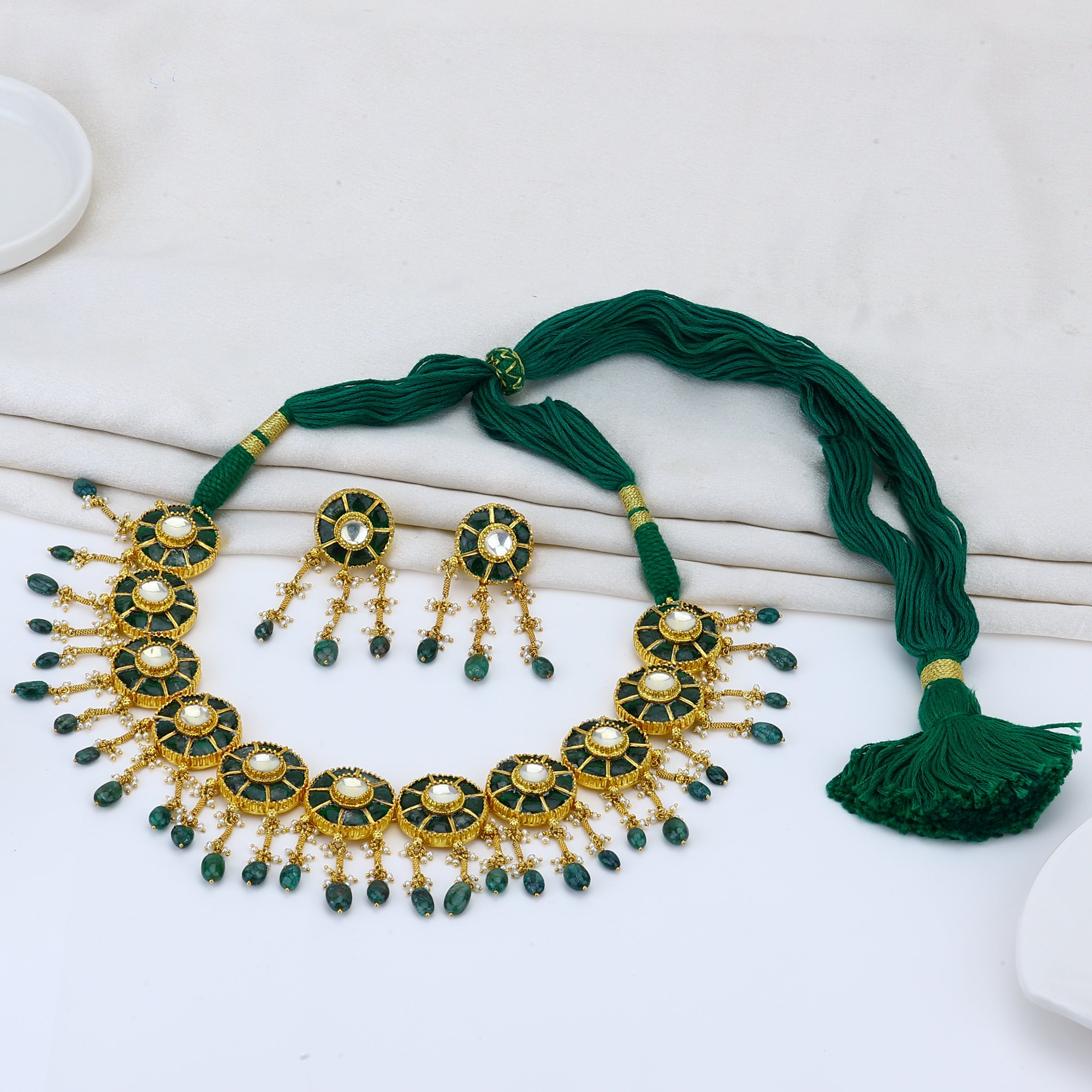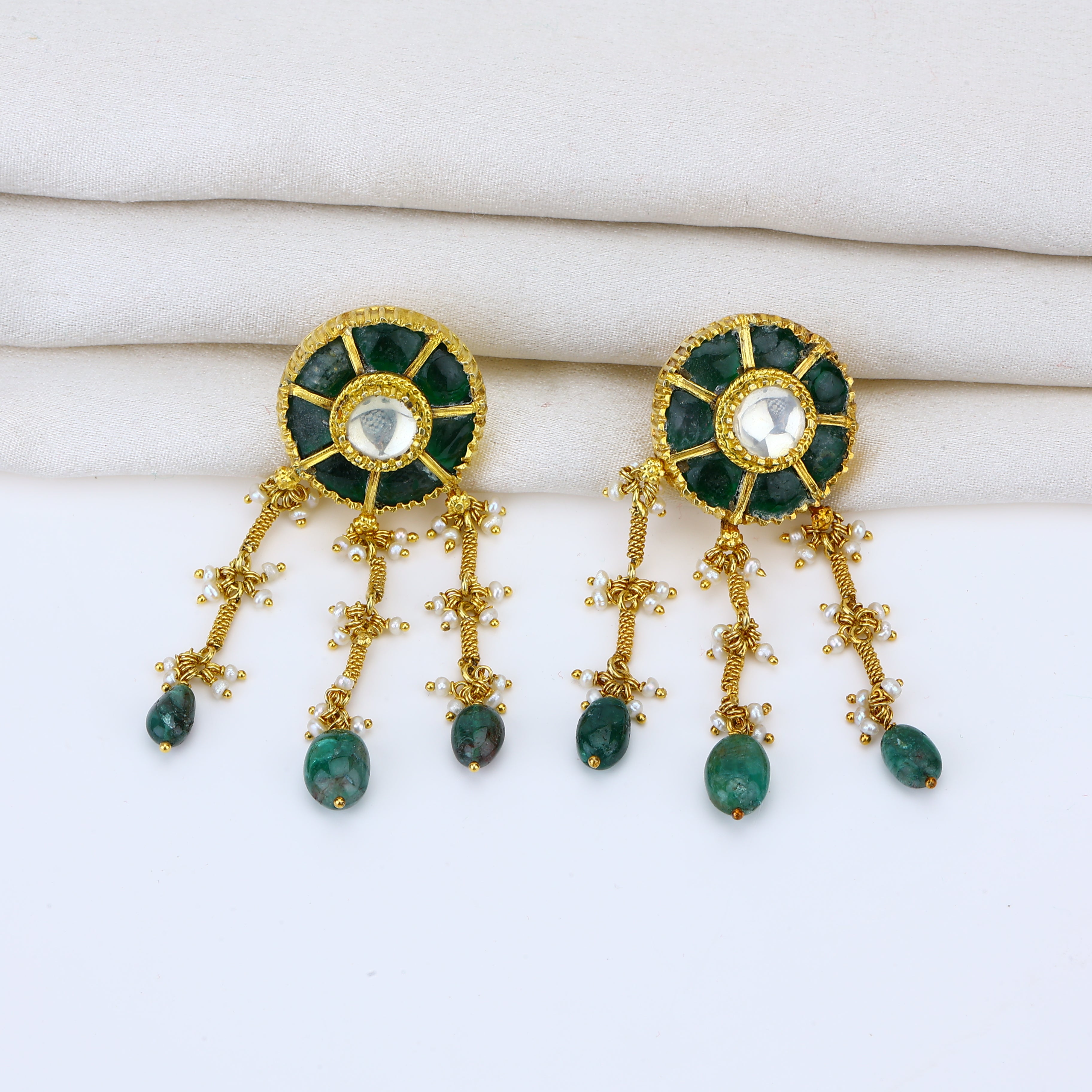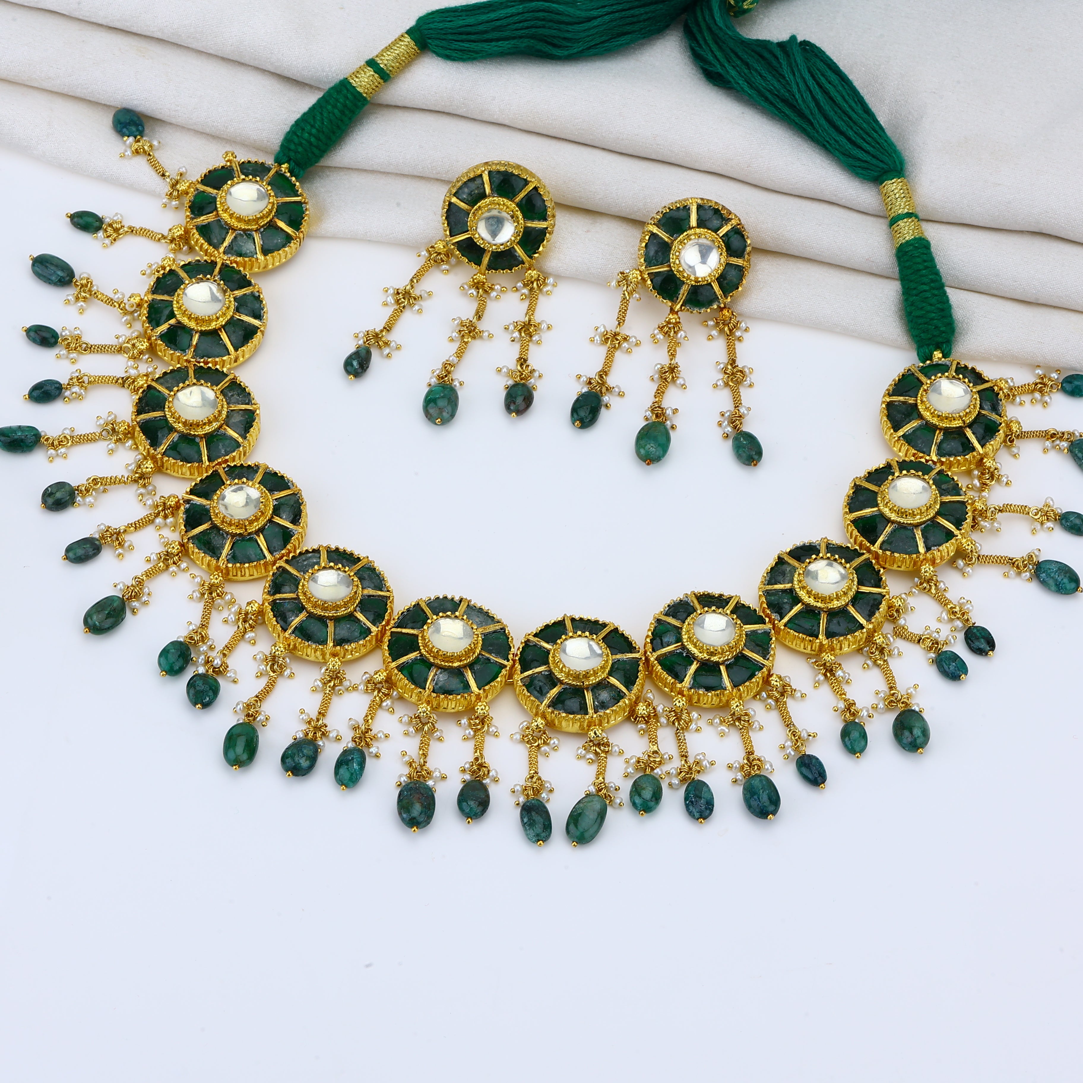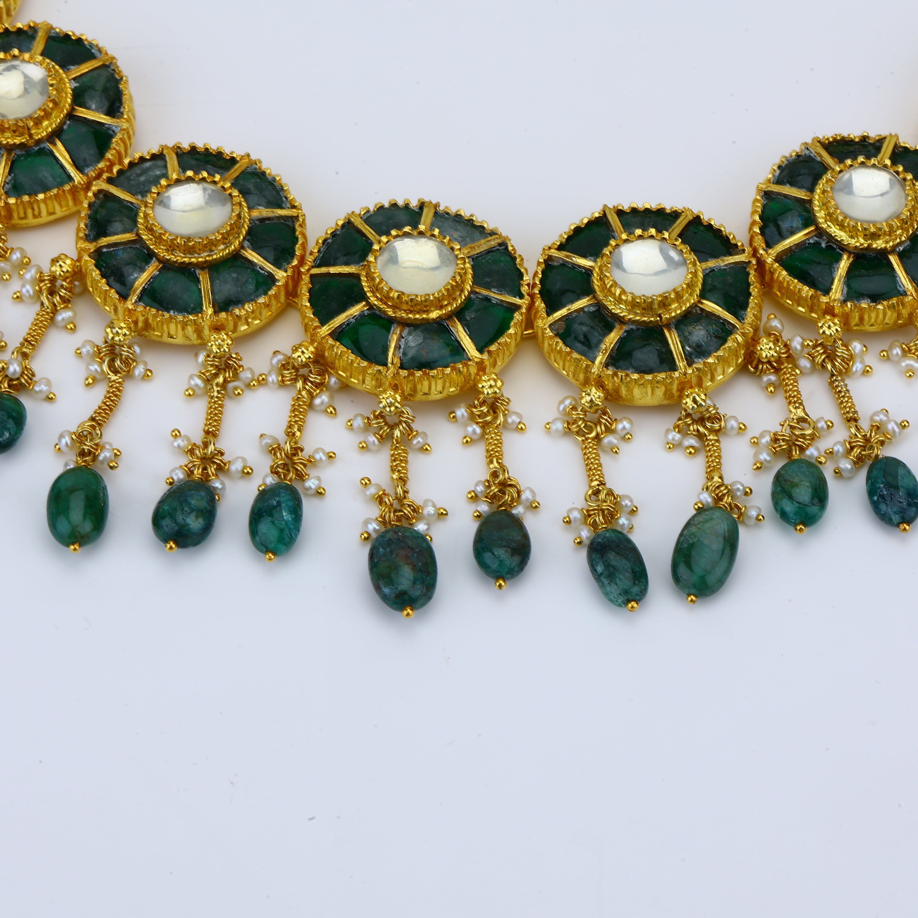 Deep in the heart of a verdant forest, this exquisite necklace set awaits to ensnare all who behold its mystic allure. Natural emerald and moissanite gemstones radiate with a captivating green fire, while lustrous Khakho pearls add an ethereal glow. The 18K gold plating lends a rich, luxurious finish. But this necklace's true magic lies in the artistry of its Bengali craftsmanship—each setting meticulously handcrafted with centuries of heritage and reverence. An enchanting addition to any jewelry collection, this mystical set elevates everyday looks and special occasions alike with its earthy yet glamorous charm. Indulge in nature's bounty, and let this Mystic Forest necklace cast its sublime spell.