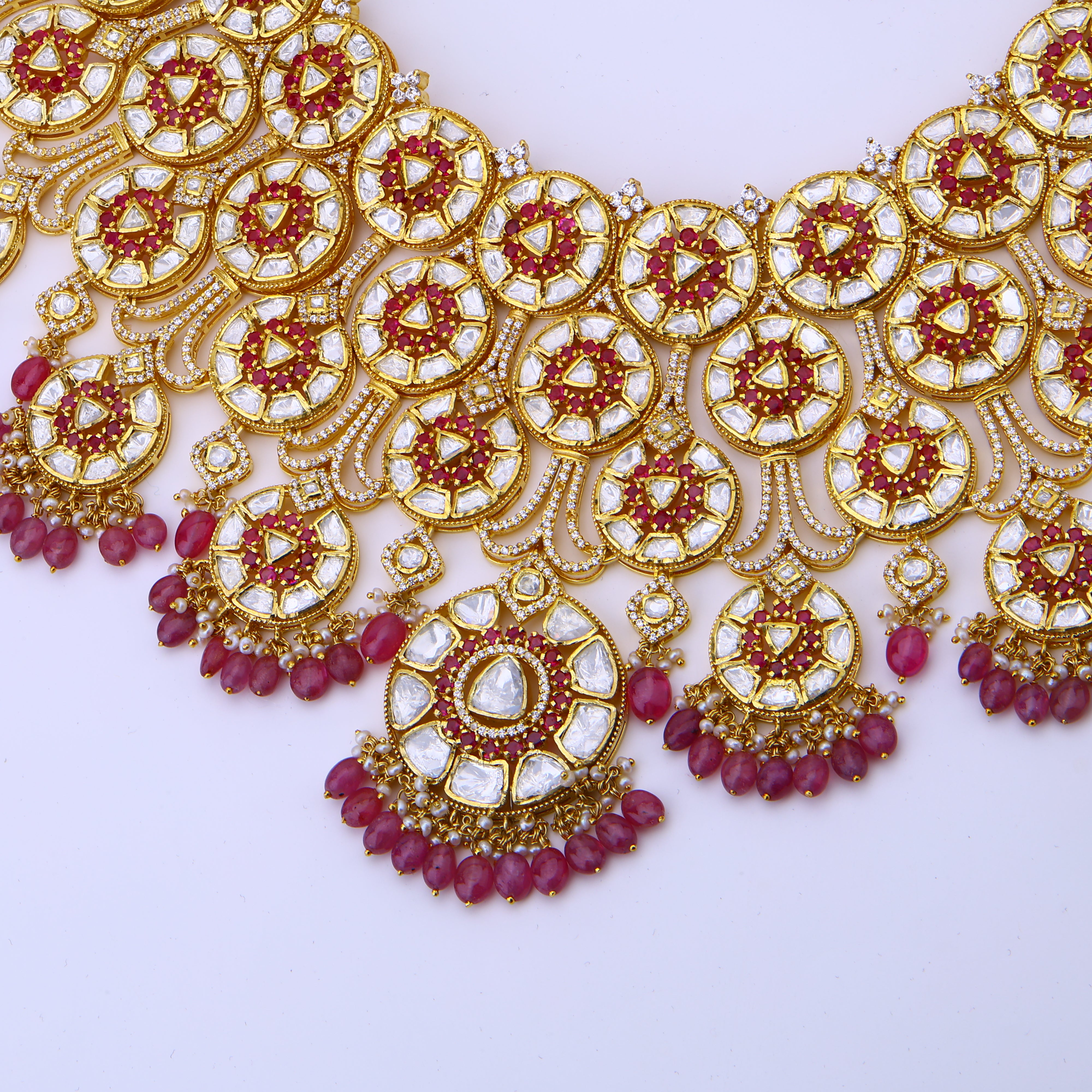 Romance radiates from every breathtaking facet of the Wheel of Passion necklace set. Fiery rubies and dazzling moissanites glow with ardor atop an 18K gold plated canvas. Each exquisite piece is a masterclass in Bengali craftsmanship, born from a heritage of artistry and desire. Just slip this sumptuous adornment around your neck and feel the heat rise—you'll leave a trail of stunned admirers in your wake. Whether marking an anniversary, birthday or simply celebrating love itself, the Wheel of Passion honours life's most impassioned moments with soul-stirring elegance. After all, what could make a grander statement than dripping in gems so rich and regal they seem to have been plucked from a sultan's treasure trove? Prepare to smoulder.