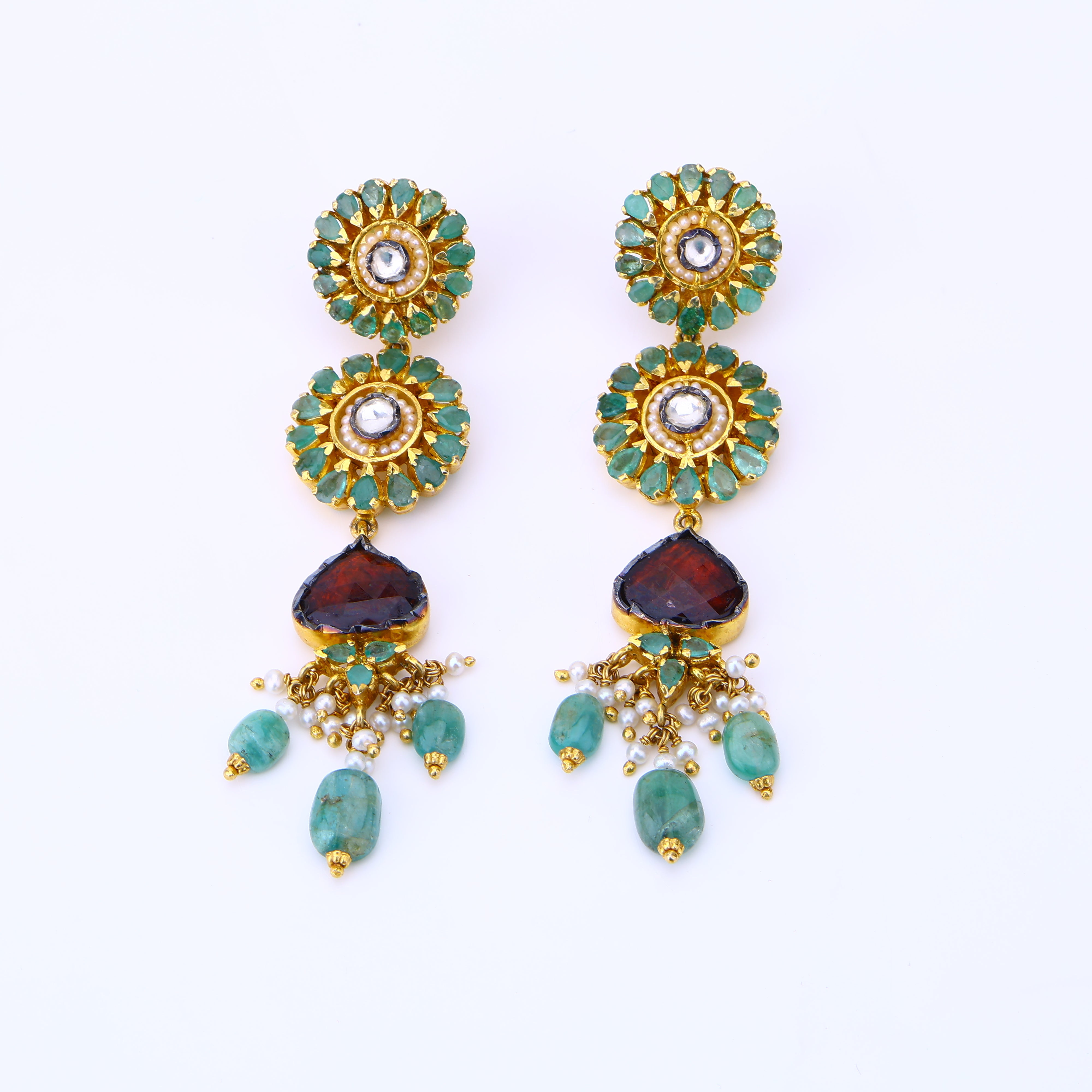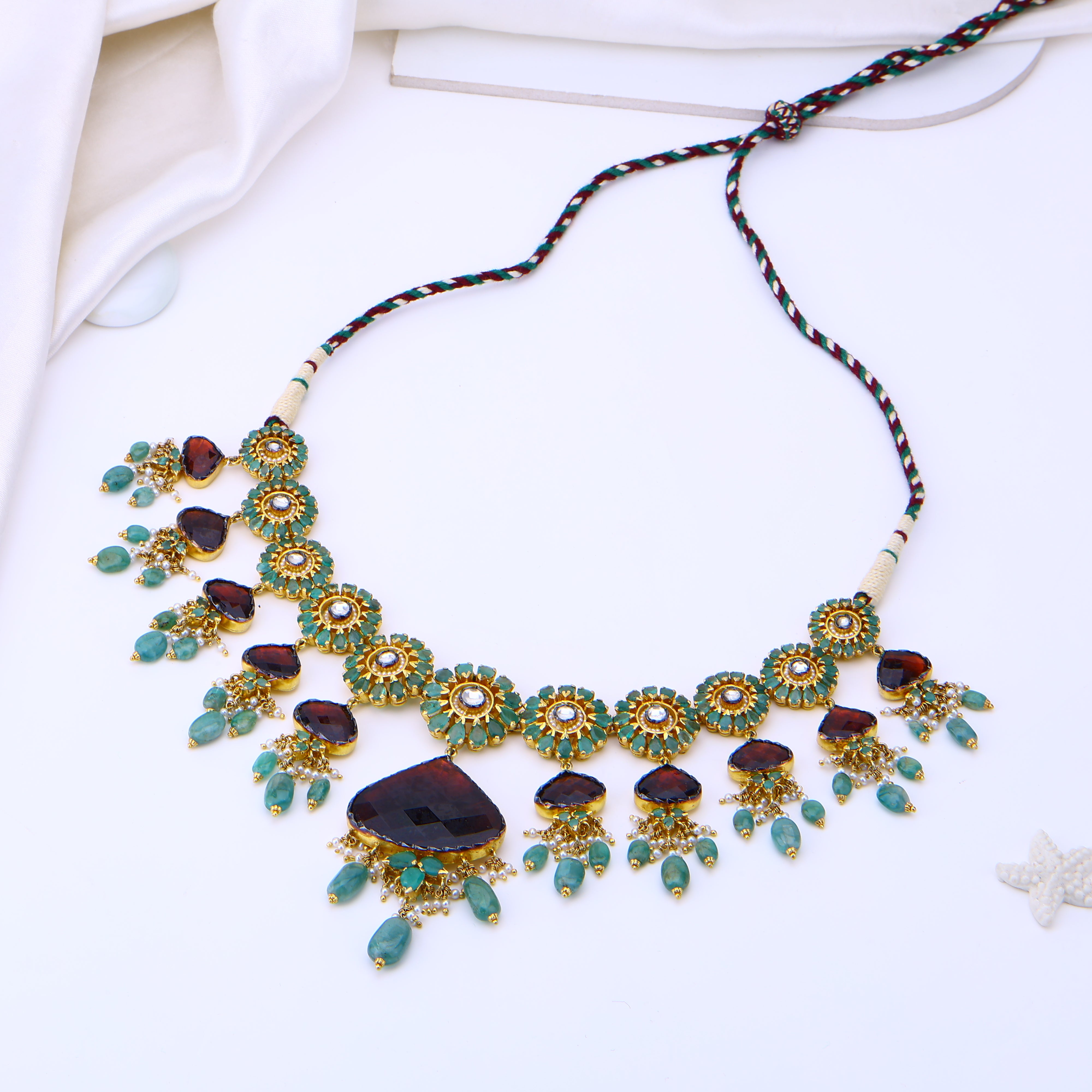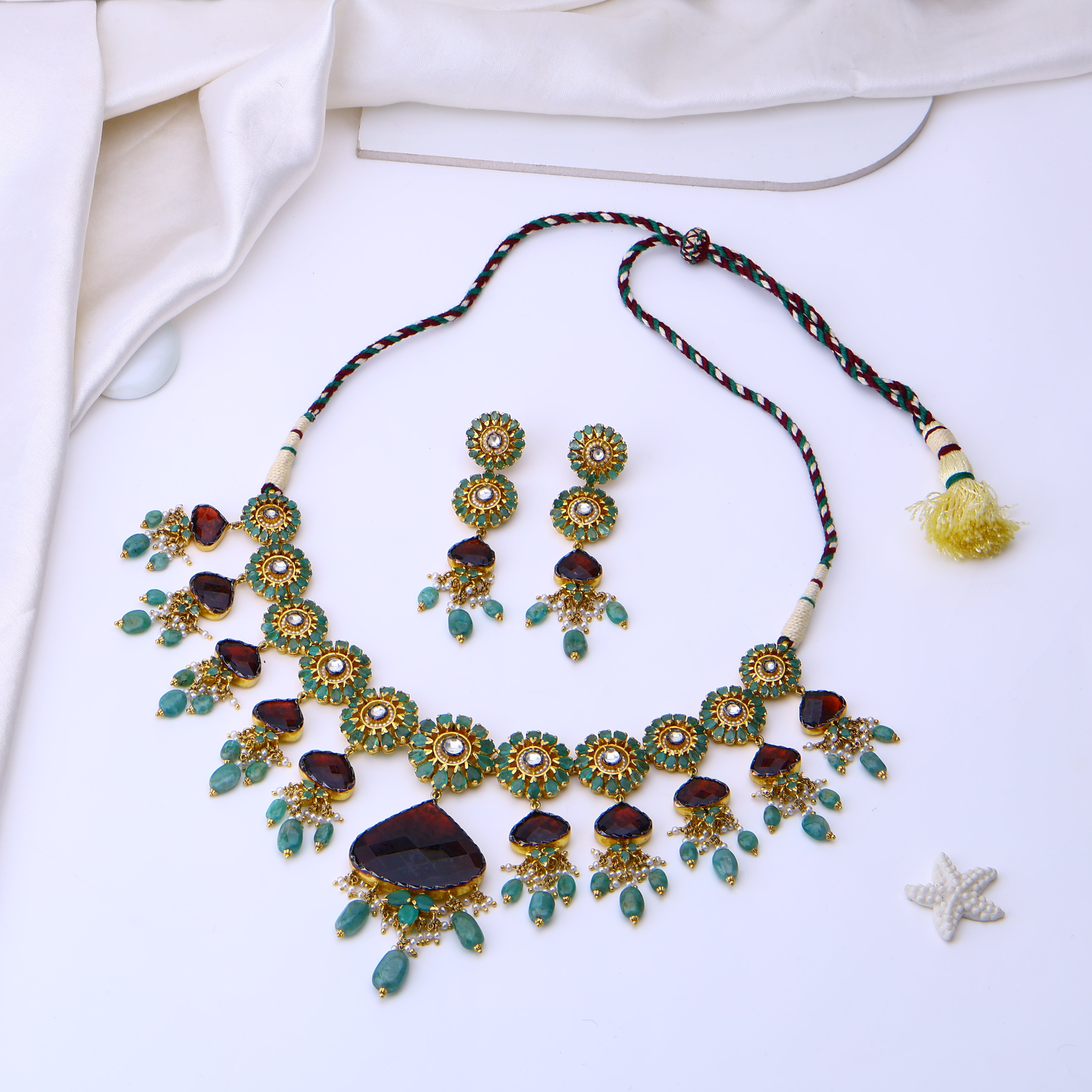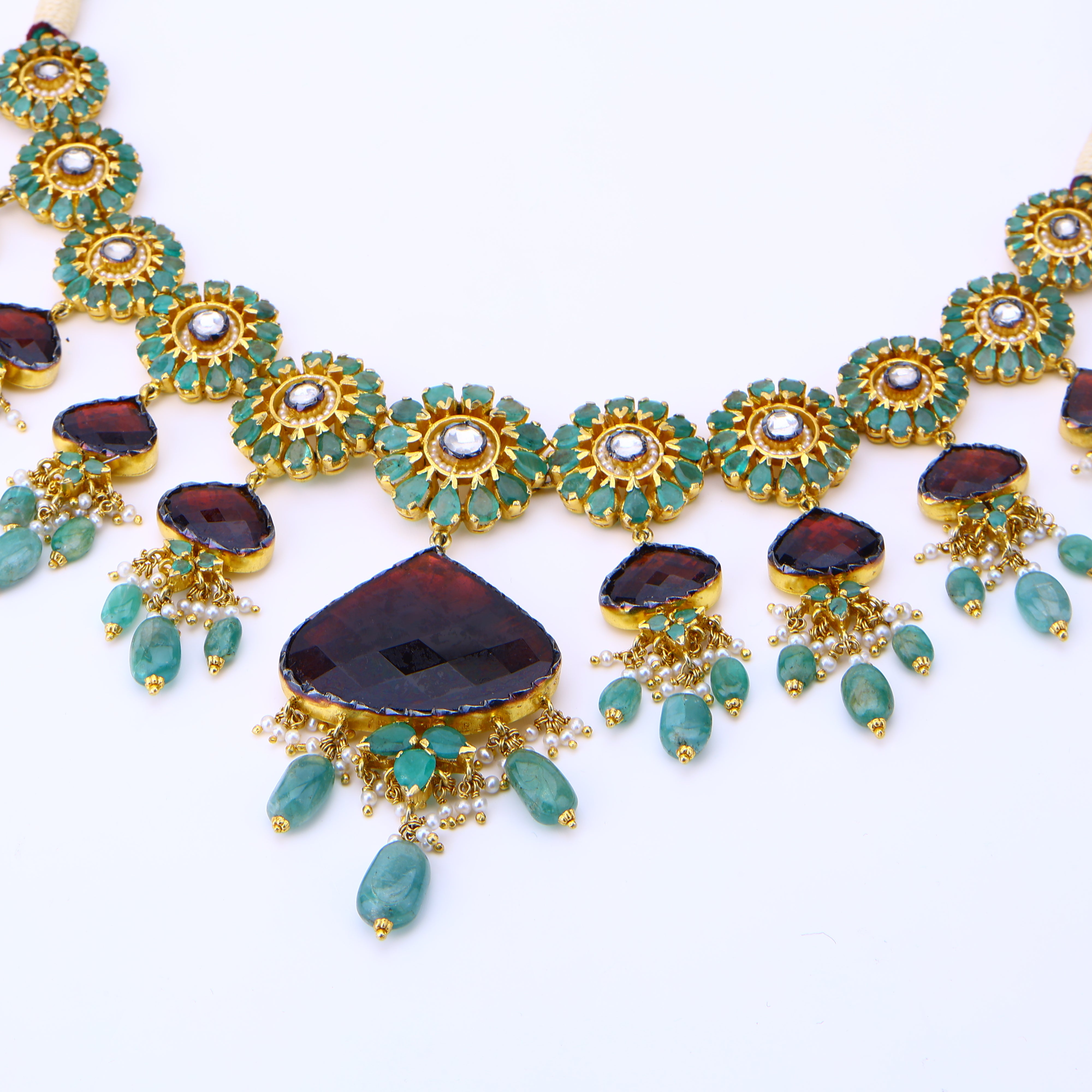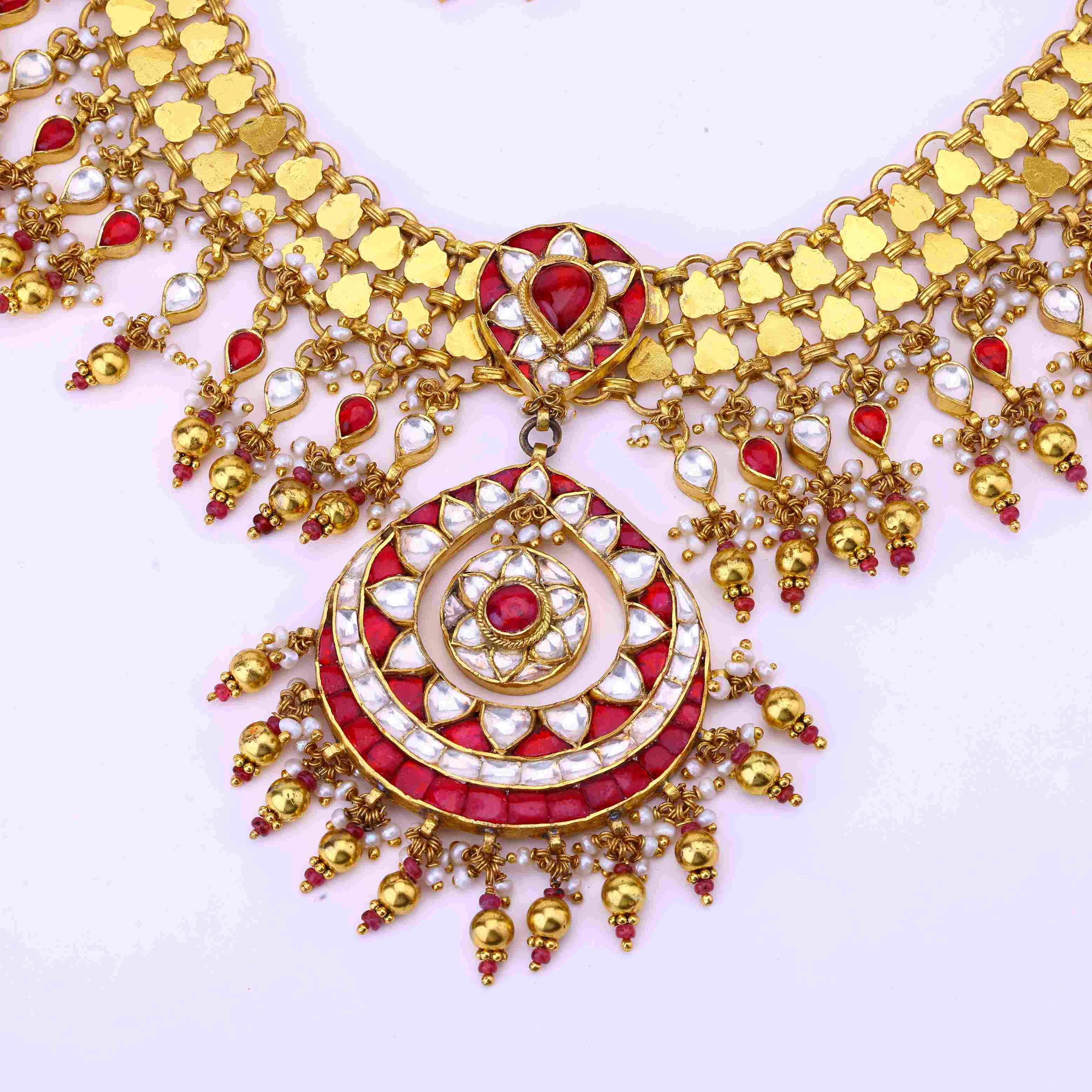 Each radiant ruby, luminous pearl, and sparkling gem is thoughtfully embedded in this regal necklace set—a true masterpiece of jadau craftsmanship. Hailing from a tradition of artisanal jewelry-making, its intricate detailing evokes visions of opulent palace jewels from a bygone era. Yet despite its lavish precious stones and 18K gold plating, this heirloom-quality set effortlessly complements modern ensembles, lending an air of regality to any look. With its lustrous moissanite centerpiece framed in ruby-studded jadau, it makes a bold yet refined statement for day or night. Rare is the jewelry that can transport you to a world of luxury while being utterly wearable. But that's the magic of jadau—and this necklace set brings it to life.